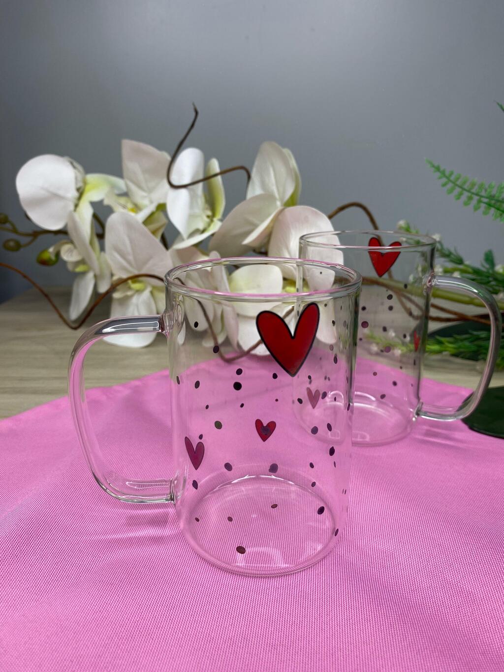 Os desenhos de coração gravados no vidro tornam estas canecas não apenas funcionais, mas também visualmente cativantes, adicionando um toque de amor e carinho à sua bebida favorita.