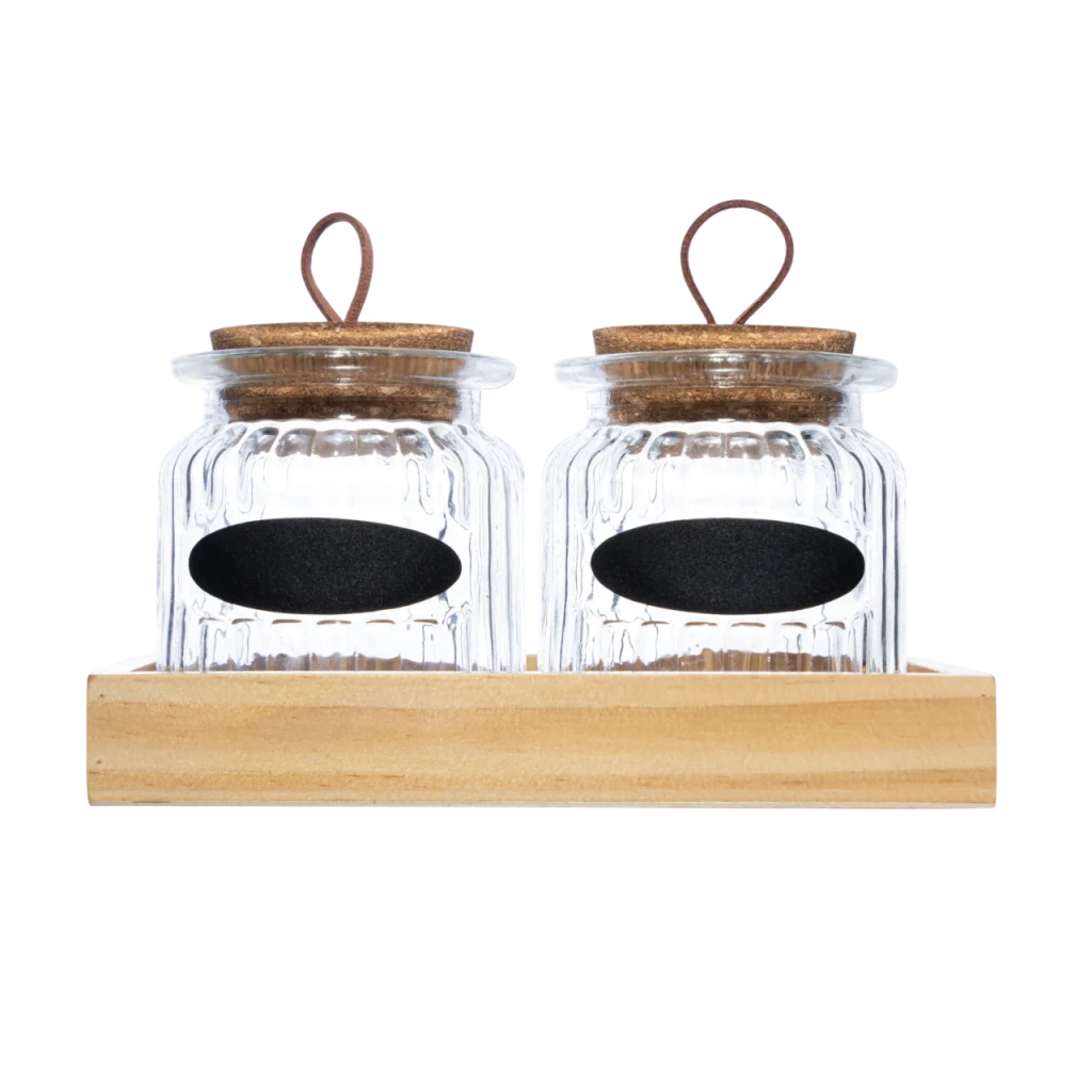 Conjunto 2 Potes com Tampa de Cortiça e Suporte de Madeira 260ml Vidro