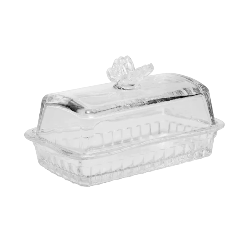 Apresentamos a encantadora Manteigueira de Vidro com Tampa Butterfly da Wolff, uma peça delicada e funcional para armazenar e servir manteiga com elegância.