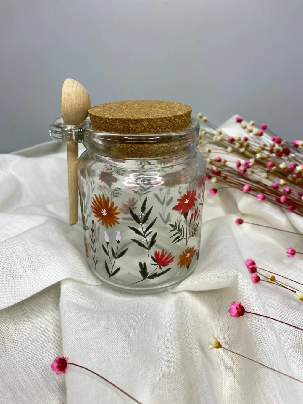 Seu design encantador, com flores pintadas no vidro, adiciona um toque romântico e sofisticado ao ambiente, enquanto a colher de bambu traz praticidade no manuseio dos ingredientes.